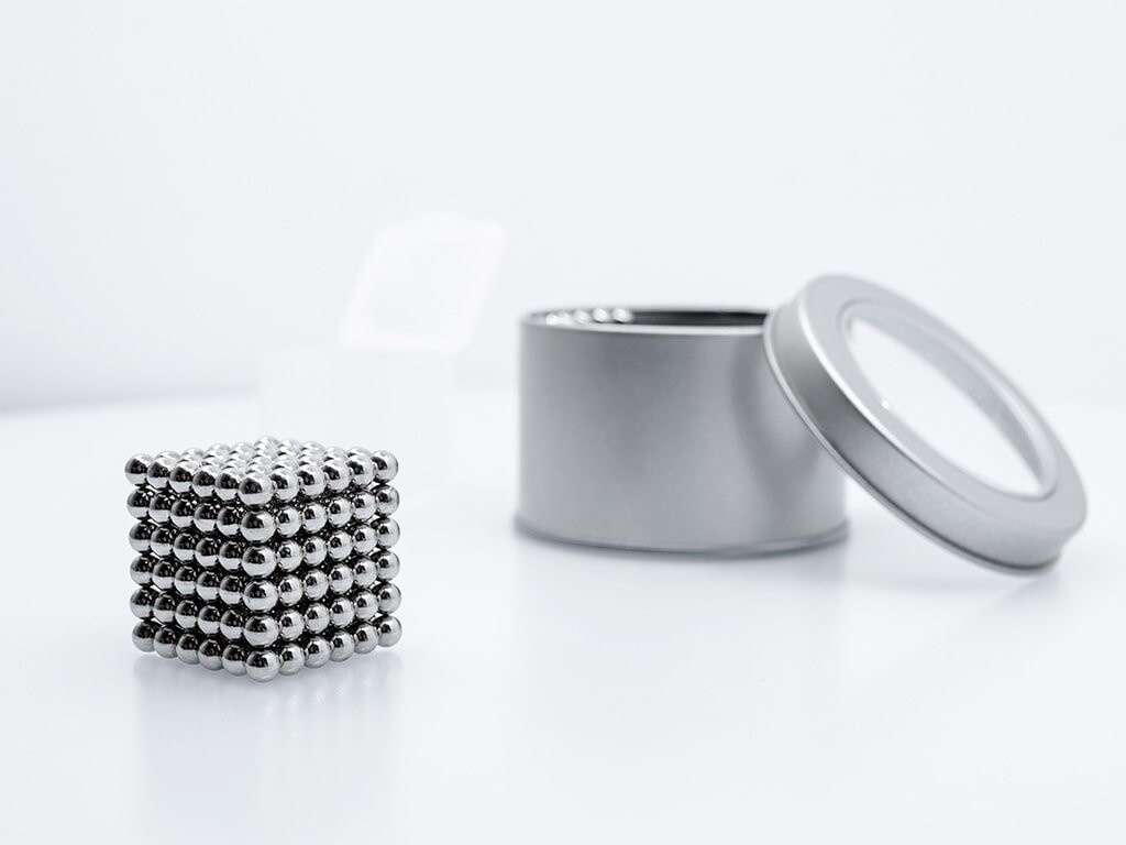 Magnetická stavebnice NeoCube Original je složená z 216 silných magnetických kuliček o průměru 5 milimetrů.